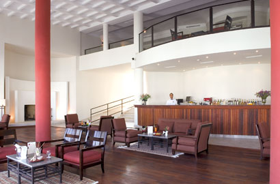 Sérénité et douceur au bar Le Florian, avec son parquet en bois, ses meubles aux couleurs brunes et chaudes et sa cheminée moderne et chaleureuse.